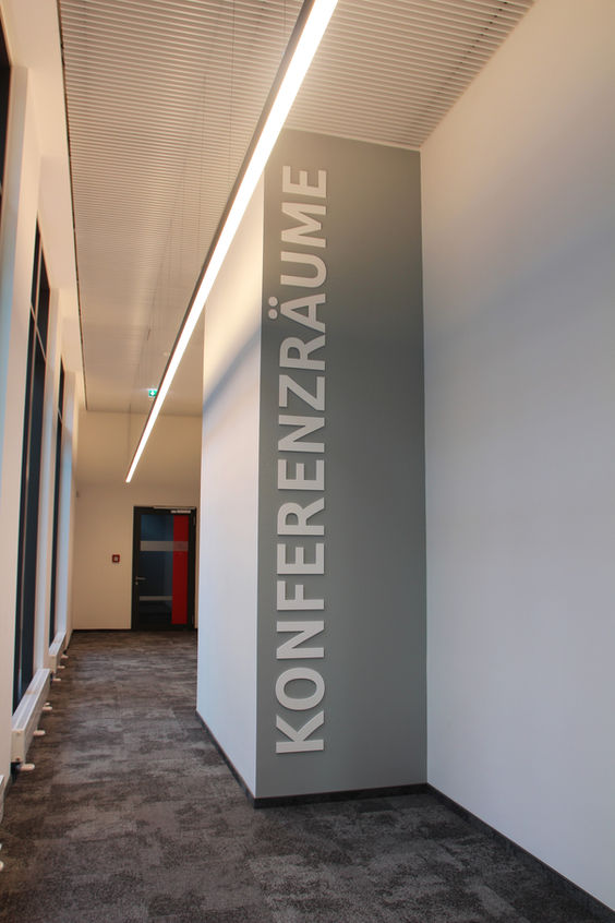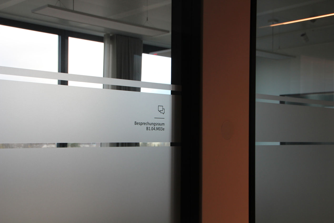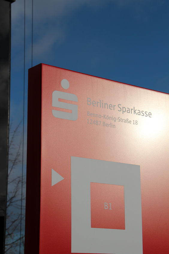 The Susanne Philippson office planned, designed and realized a wayfinding system for the headquarter of the Berliner Sparkasse in the Adlershof district of Berlin. My role in this project together with the team was the graphic design of the elements, the creation of the final artwork and the planning and coordination of the technical implementation. The main aim was to keep the corporate identity of the bank in mind and to shape it into the headquarter. The building itself is divided into two parts and is connected by bridges. It was therefore a great challenge to guide the employees through the building to their offices. In addition to floor indicators or labels for the rooms, many small special solutions such as small notices or signs for rescue routes were created. The highlight is the 7-meter red glass stele and an LED wall in the foyer of the building. From a distance, visitors are guided to the entrances with red beautiful steles on the outside.